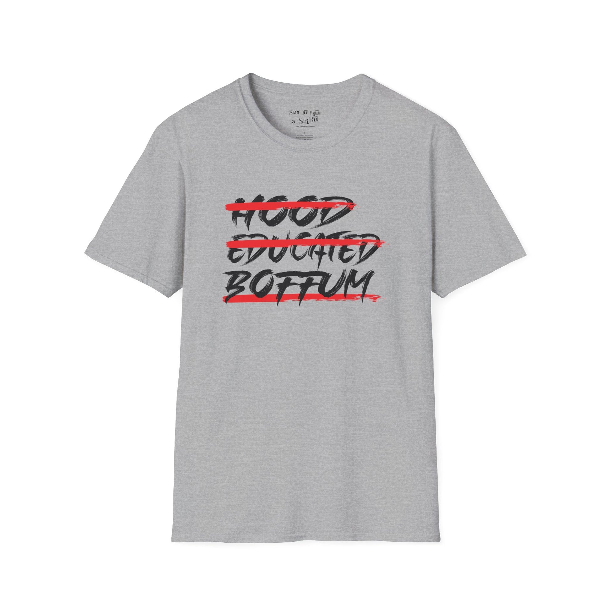 "Show off your unique style and attitude with the Hood Educated Boffum Tee Shirt! This bold graphic tee features striking crossed-out words that celebrate your roots, education, and individuality. Perfect for those who proudly represent their journey and are unapologetic about where they’ve come from. Whether you’re hitting the streets or just relaxing with friends, this tee makes a powerful statement.