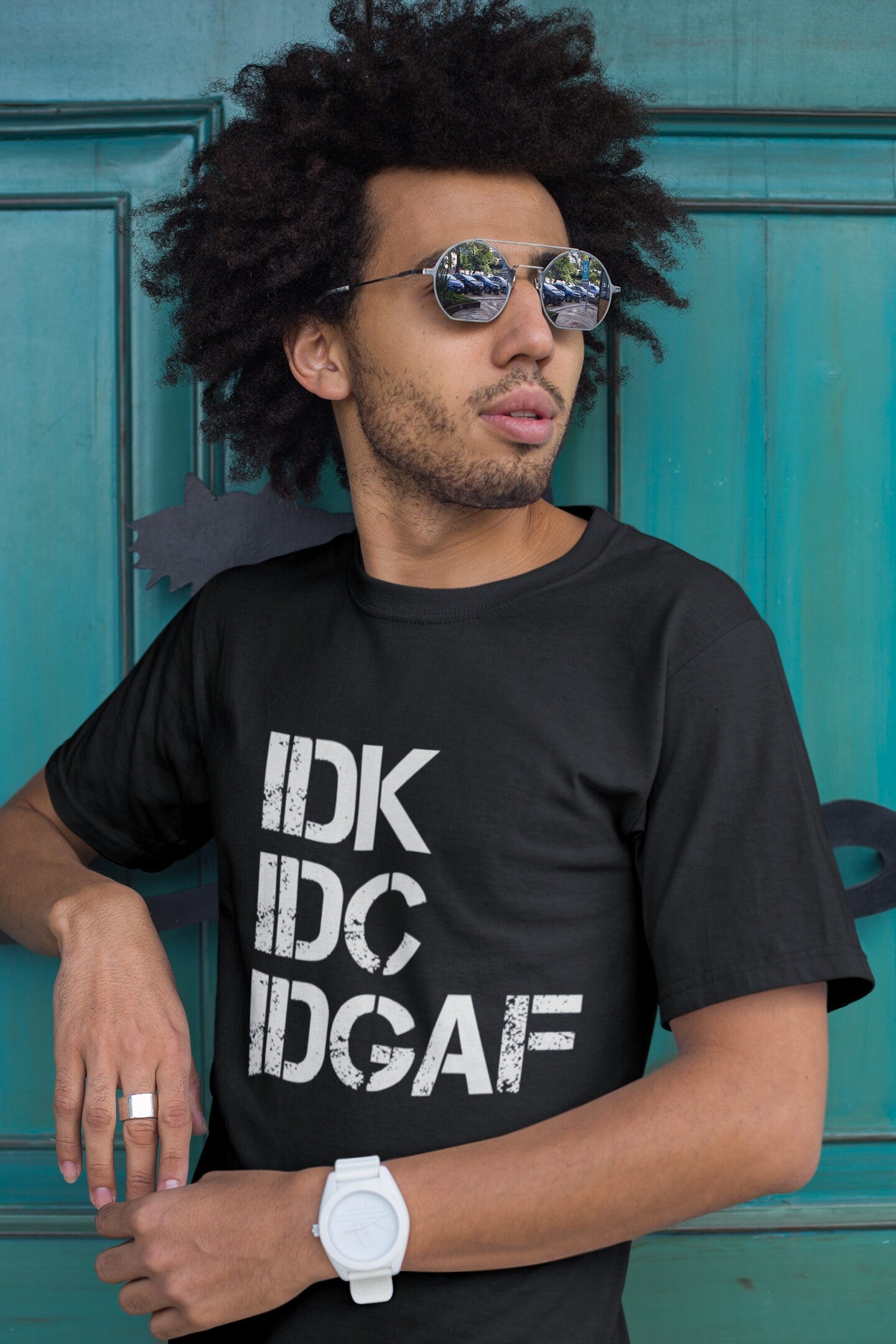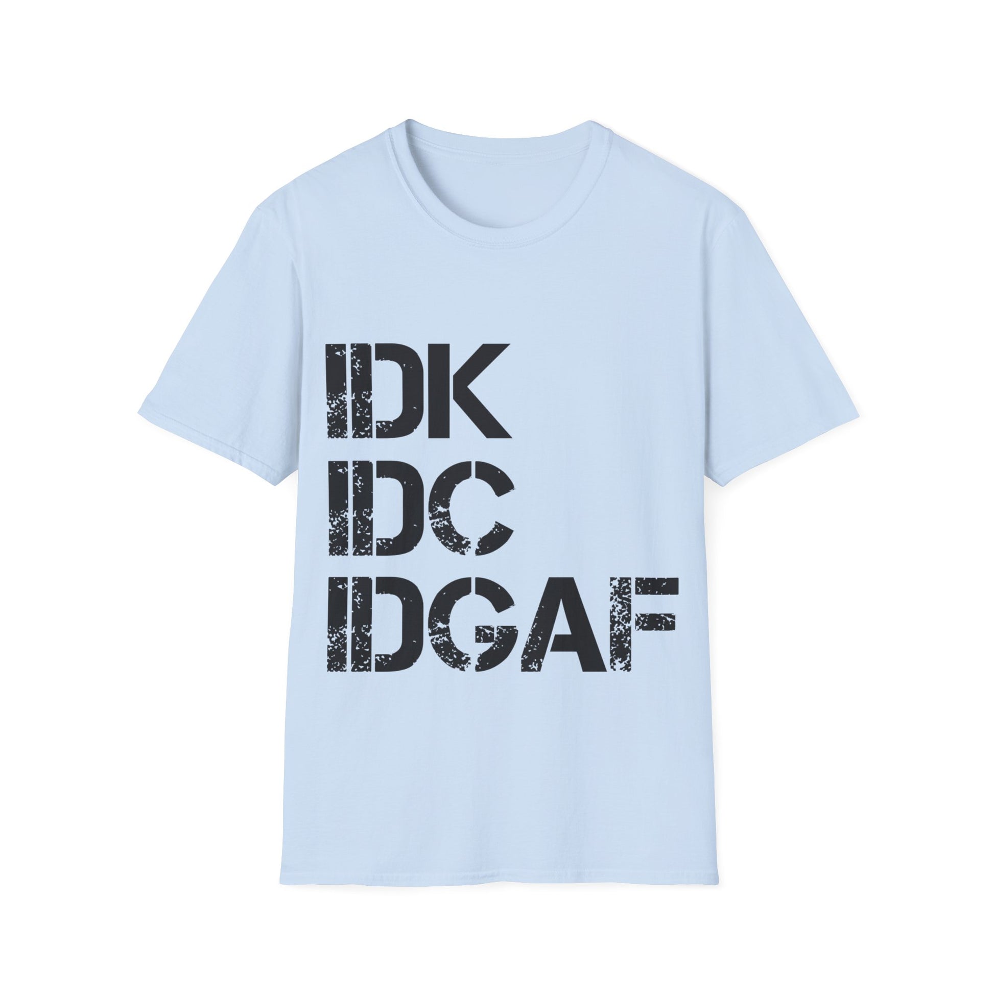 "Embrace the carefree attitude with our 'IDK, IDC, IDGAF' tee shirt - the perfect expression of laid-back vibes and effortless style! Whether you're shrugging off the small stuff or embracing a 'go with the flow' mindset, this tee is your ultimate companion. Crafted with soft, breathable fabric for all-day comfort, it's the perfect addition to your casual wardrobe. Wear it with confidence and let the world know you're unapologetically you. Order now and make a statement without saying a word!"