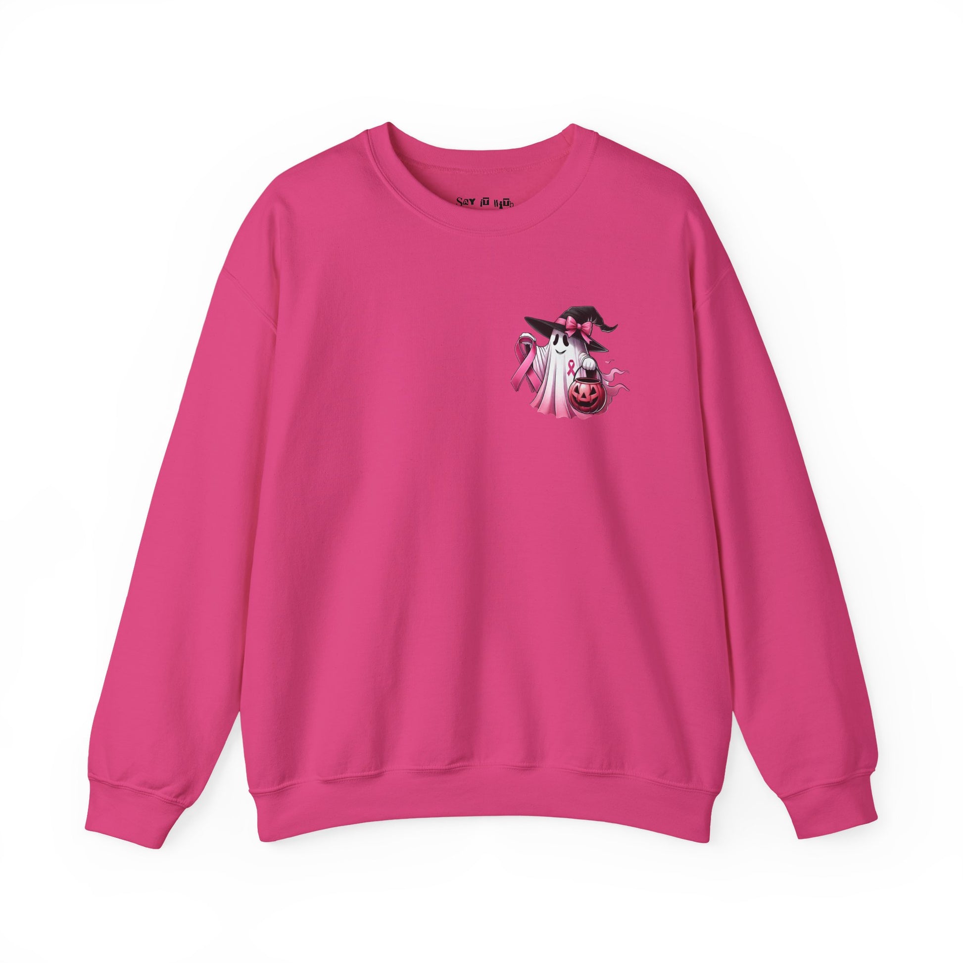 With the front design featuring a subtle ghost and ribbon accent, and the back reading βIn October We Wear Pink β Breast Cancer Awarenessβ, this sweatshirt makes a bold statement of unity and strength.