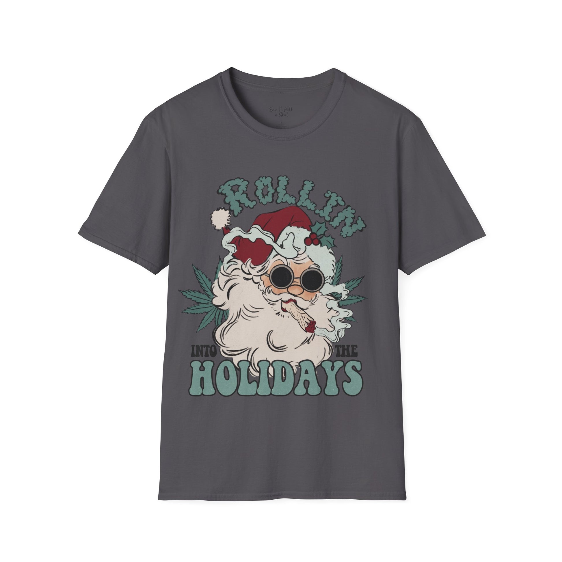 🎅 Funny Holiday Graphic – Retro illustrated Santa with smoke details and vintage lettering: “Rollin’ Into the Holidays.”