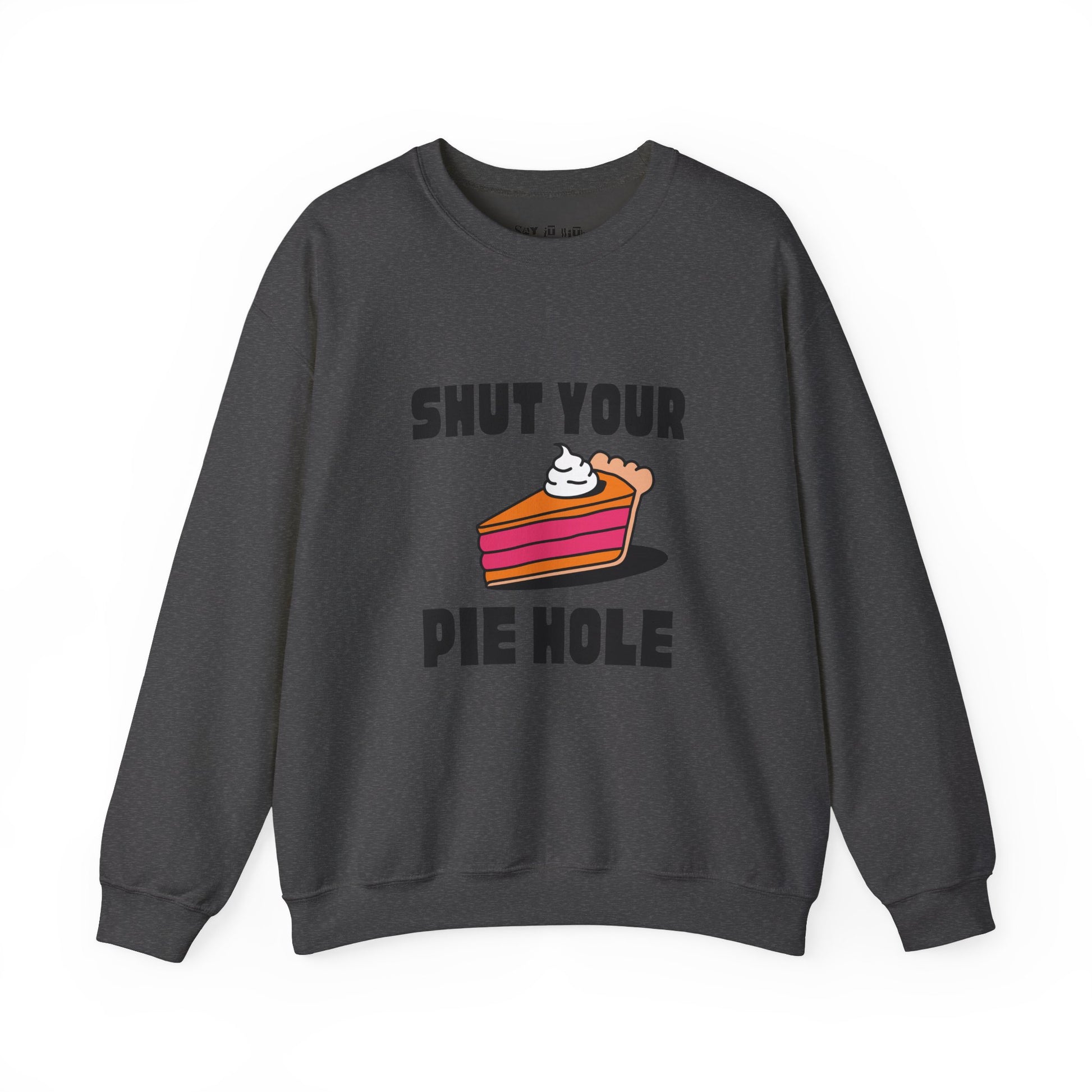 shut your pie hole, funny holiday sweater, Thanksgiving humor, sarcastic sweatshirt, pie slice graphic, holiday family shirt, funny Thanksgiving, cozy holiday wear, humorous sweatshirt, foodie sarcasm, Friendsgiving apparel, pie lover shirt, sarcastic holiday