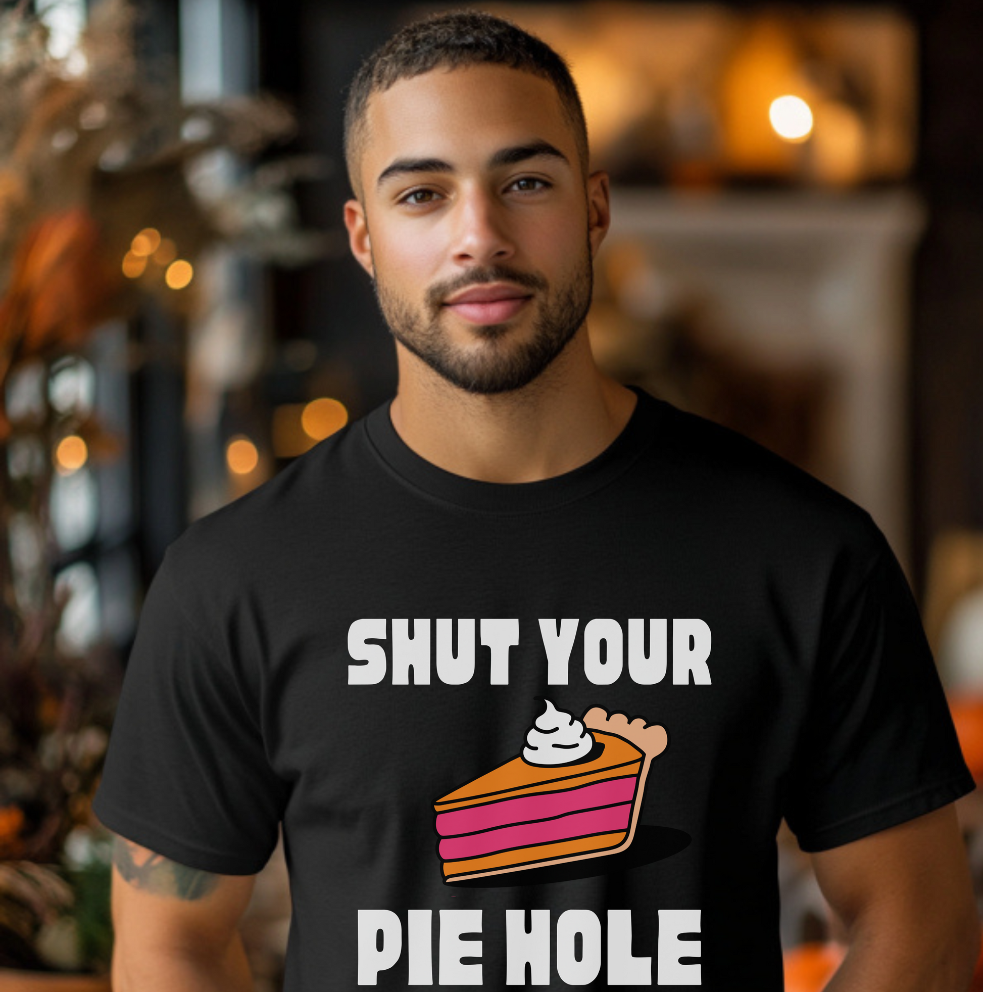 Serve up some sarcasm this holiday season with our "Shut Your Pie Hole" T-shirt! Perfect for those family gatherings where you need a little humor to keep things light (and maybe a gentle reminder to a few chatty relatives). This funny tee features a slice of pie graphic with a message that says it all—ideal for Thanksgiving, Friendsgiving, or any day you’re feeling a little spicy! Soft, comfy, and full of attitude, this shirt makes a hilarious gift or a statement piece for anyone who appreciates a good laugh with their pie. Wear it proudly, and let the pie do the talking!
