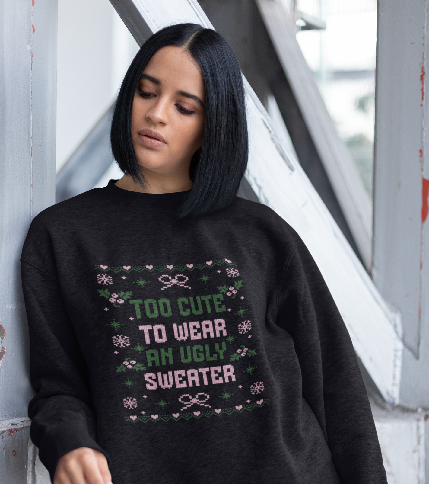 Make your holiday wardrobe as stylish as your personality. Order your “Too Cute to Wear an Ugly Sweater” Sweatshirt today and enjoy the season with confidence and charm!