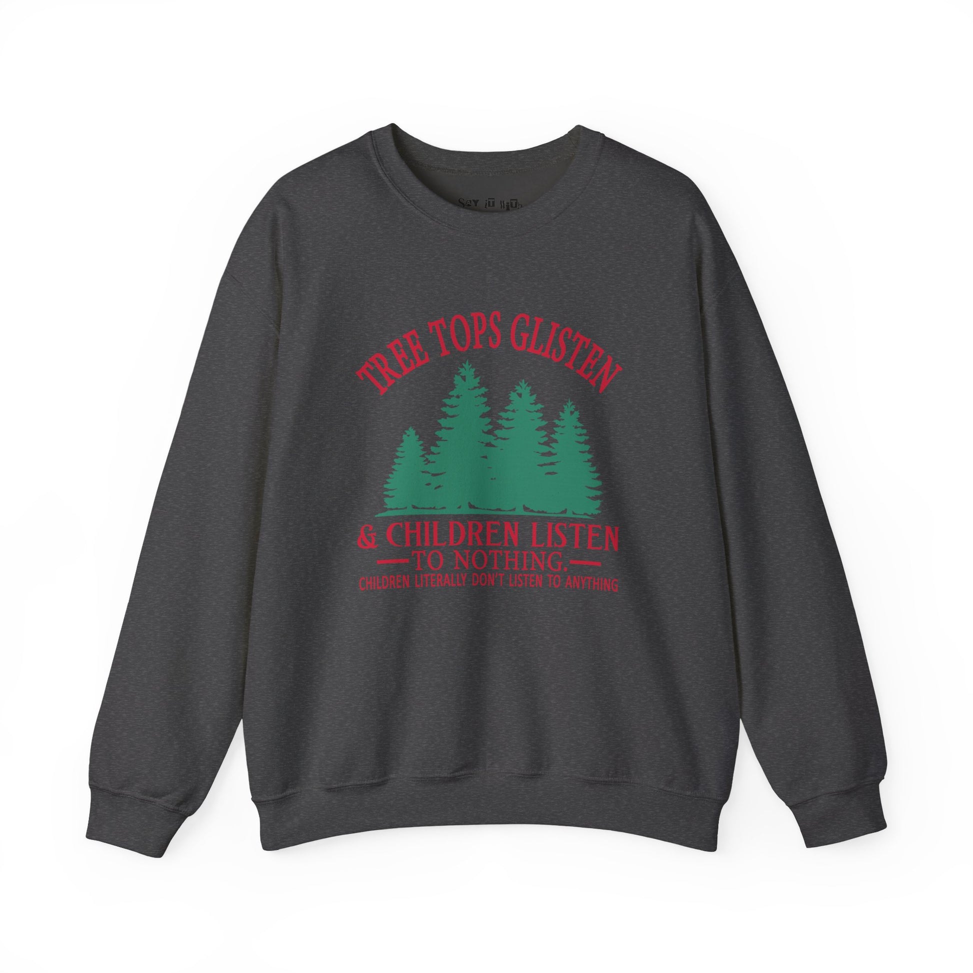 This cozy Christmas crewneck flips the classic lyric into the truth every parent knows: Tree tops glisten & children listen… to nothing.