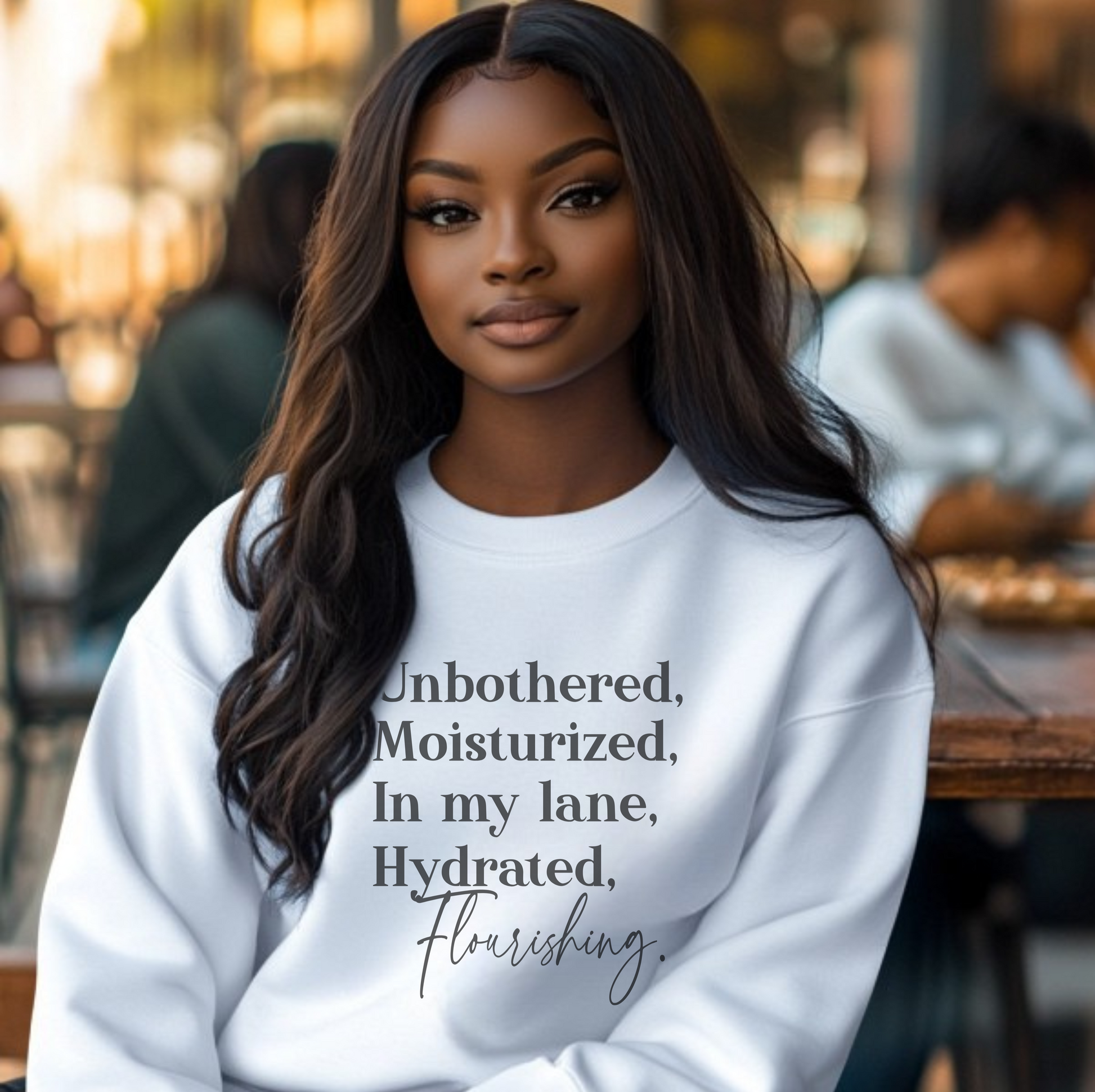Elevate your self-care wardrobe with this "Unbothered, Moisturized, In My Lane, Hydrated, Flourishing" sweatshirt. πΏβ¨ Crafted for comfort and style, this chic and minimalist sweatshirt is perfect for embracing a relaxed vibe while making a bold statement about self-love and empowerment. Its clean typography and timeless message make it ideal for casual days, lounging, or stepping out in confidence.