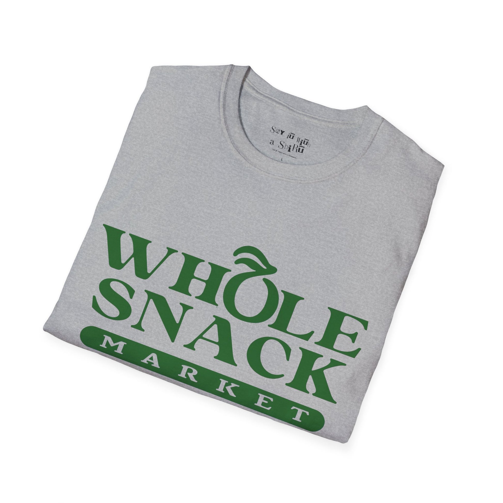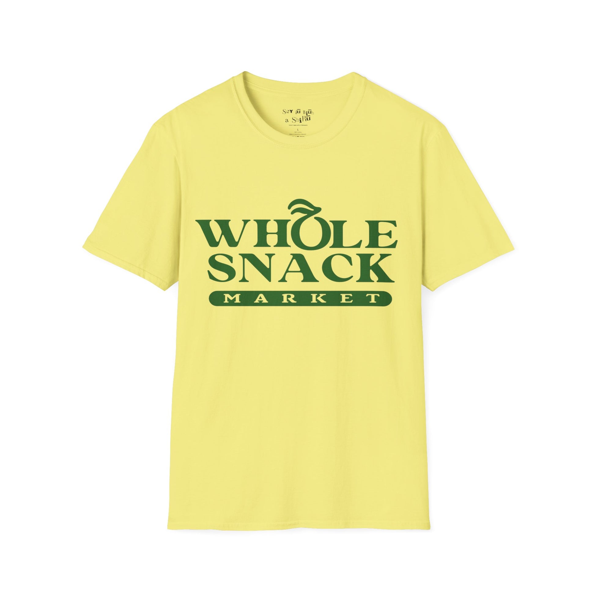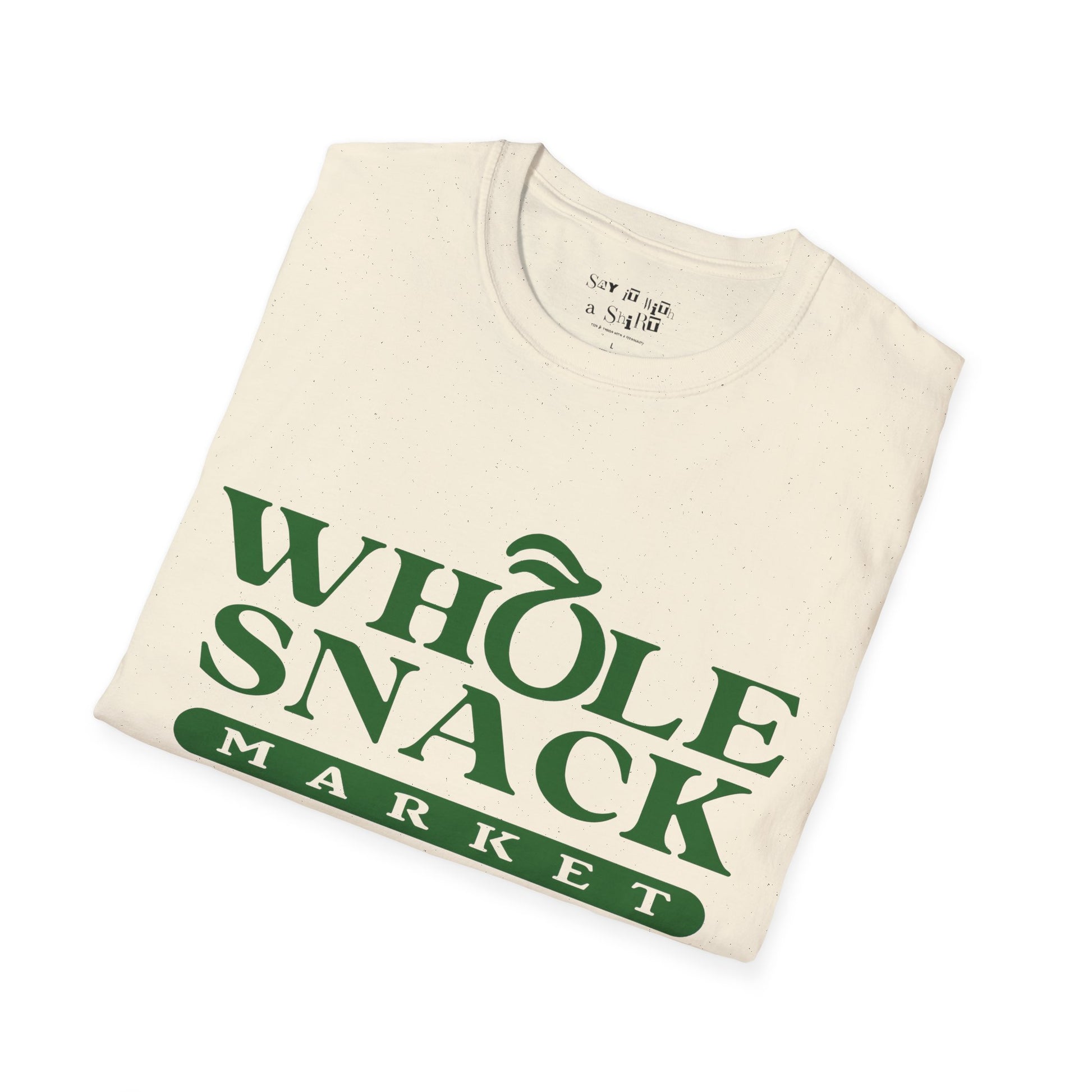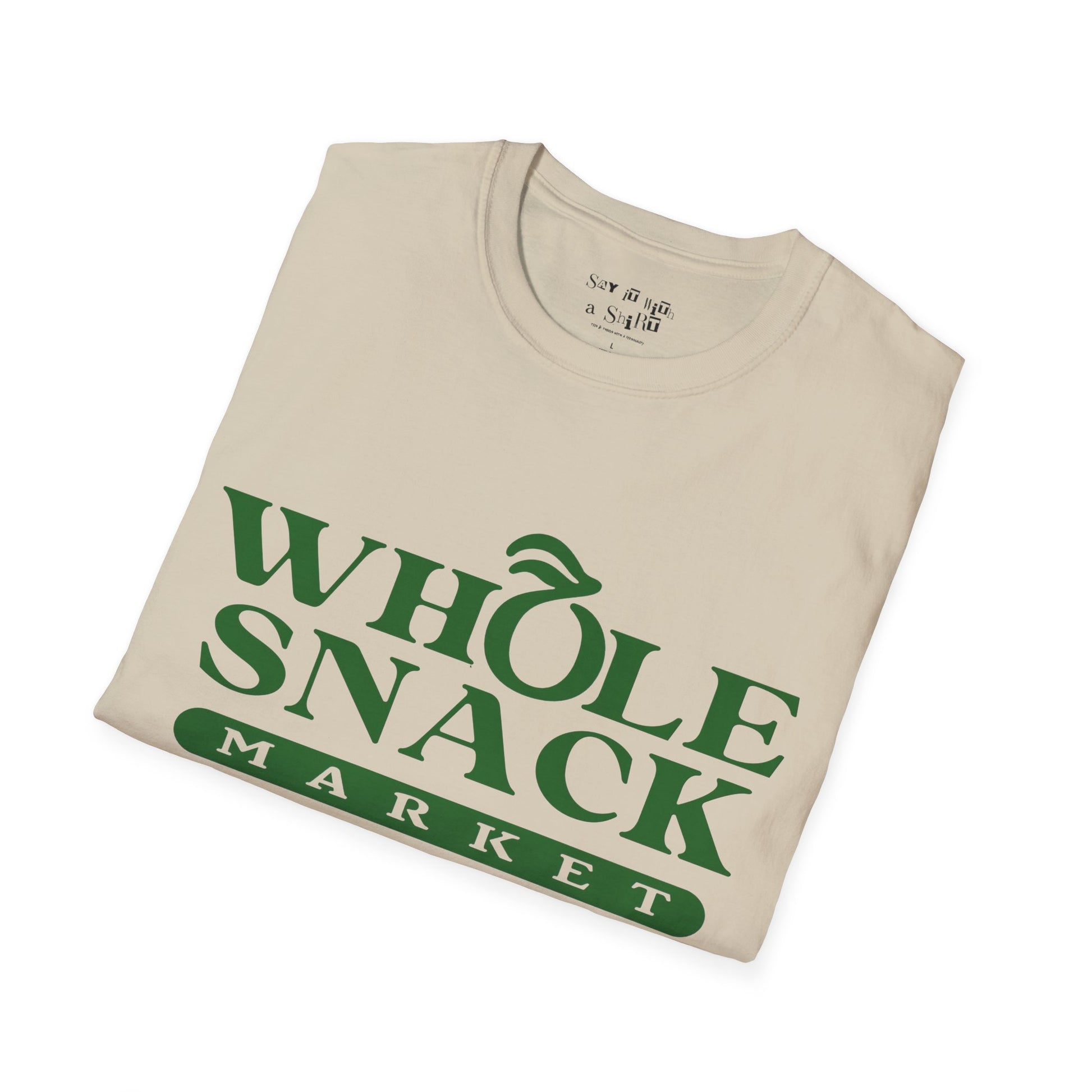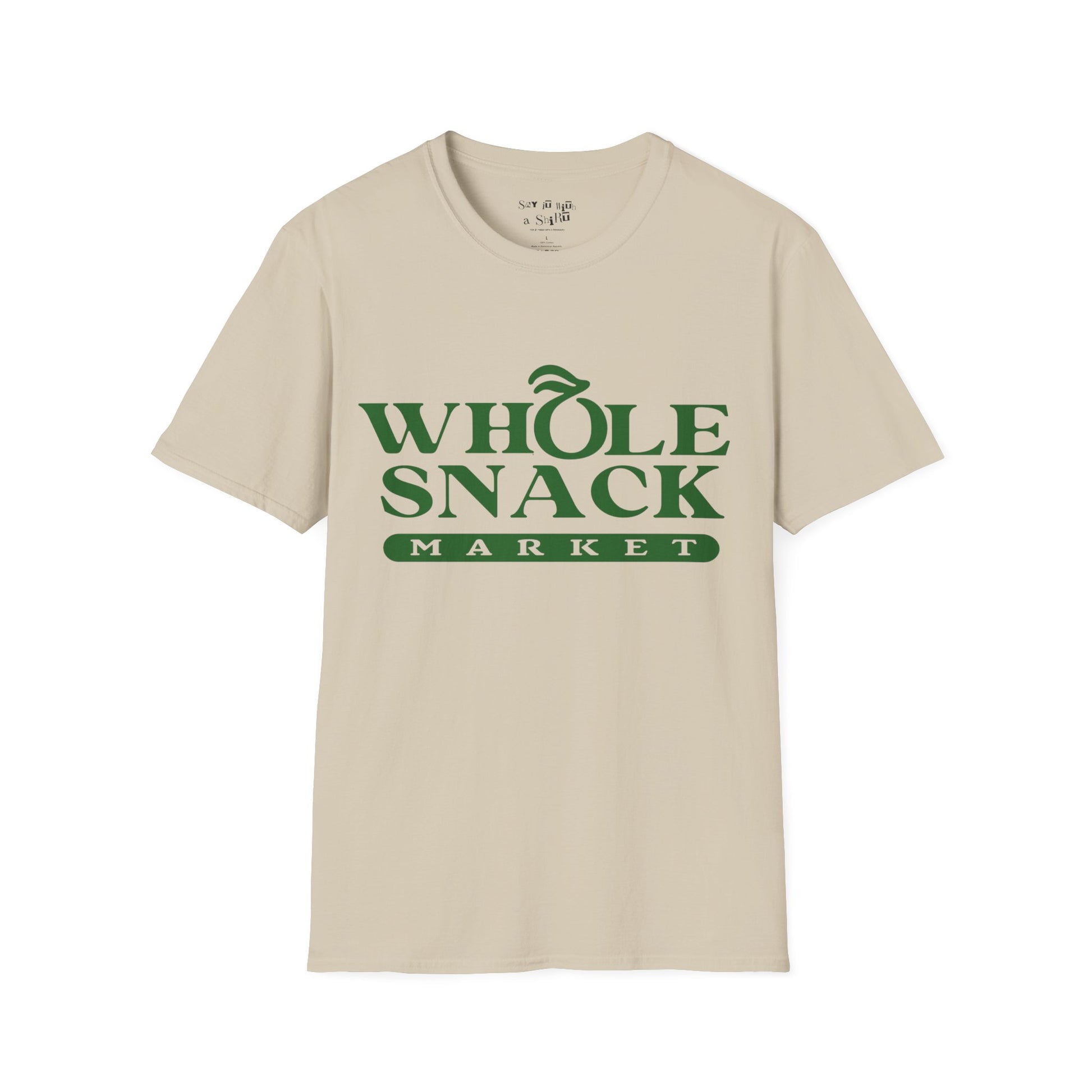 Add a playful twist to your wardrobe with this Whole Snack Market T-shirt, a cheeky parody of the grocery chain we all know. Printed with high-quality direct-to-garment (DTG) technology, this shirt delivers crisp, lasting graphics that hold up wash after wash.